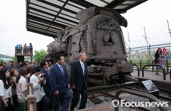 (파주=포커스뉴스) 15일 오전 경기도 파주 임진각 통일전망대에서 더불어민주당 비상대책위원회의를 마친 김종인 비대위 대표와 의원들이 전시된 경의선 장단역 증기기관차를 둘러보고 있다.