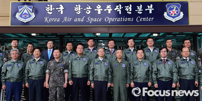 (오산=포커스뉴스) 김희옥 새누리당 혁신비대위원장과 정진석 원내대표 등 의원들이 15일 오전 경기도 오산 공군작전사령부를 방문해 이왕근 공군 작전사령관 등 군 관계자들과 기념촬영을 하고 있다.
