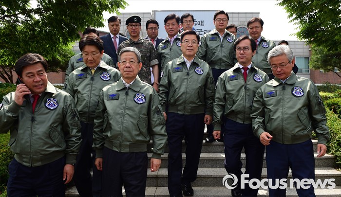 (오산=포커스뉴스) 김희옥 새누리당 혁신비상대책위원장, 김광림 정책위의장 등 의원들이 15일 오전 경기도 오산 공군작전사령부를 방문해 공군 방위태세 현황 등 보고를 받기 위해 이동하고 있다.