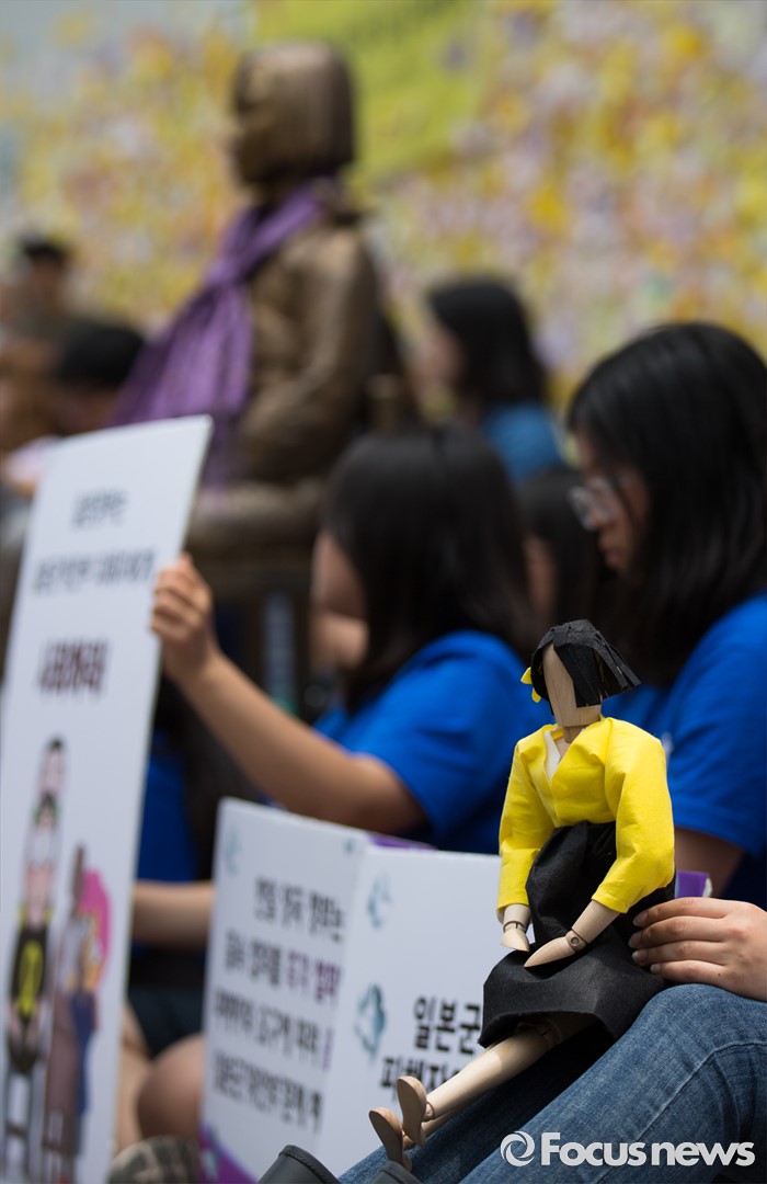 (서울=포커스뉴스) 15일 오후 서울 종로구 옛 일본대사관 앞에서 열린 제1235차 일본군 위안부 문제해결을 위한 정기 수요집회 참석한 한 시민이 소녀상 인형을 들고 있다.