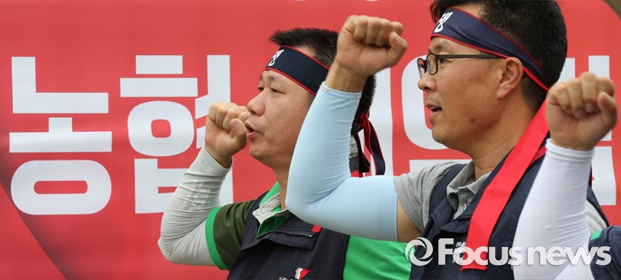 (세종=포커스뉴스) NH농협중앙회노동조합 구성원들이 15일 오전 세종시 정부세종청사 농림축산식품부 앞에서 농협법 개정안 반대 투쟁 선포식을 열고 농협법 개정반대를 촉구하고 있다.