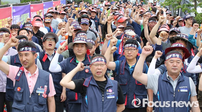 (세종=포커스뉴스) NH농협중앙회노동조합 구성원들이 15일 오전 세종시 정부세종청사 농림축산식품부 앞에서 농협법 개정안 반대 투쟁 선포식을 열고 농협법 개정반대를 촉구하고 있다.