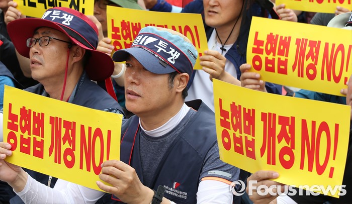 (세종=포커스뉴스) NH농협중앙회노동조합 구성원들이 15일 오전 세종시 정부세종청사 농림축산식품부 앞에서 농협법 개정안 반대 투쟁 선포식을 열고 농협법 개정반대를 촉구하고 있다.