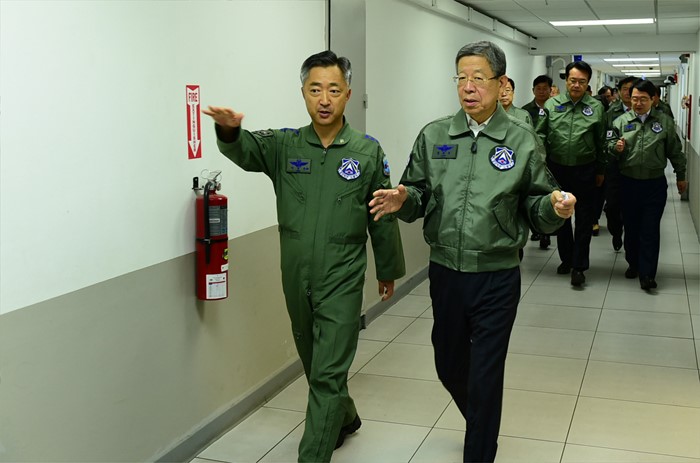 (오산=포커스뉴스) 김희옥(오른쪽) 새누리당 혁신비대위원장이 15일 경기도 오산 공군작전사령부를 방문해 이왕근 공군 작전사령관의 안내를 받으며 항공우주작전본부 내 지휘소로 이동하고 있다. <사진제공=공군>