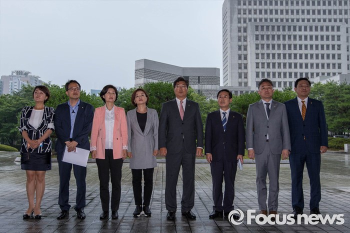(서울=포커스뉴스) 15일 오후 서울 서초구 대검찰청 앞에서 더불어민주당 '어버이연합 등 불법자금지원 의혹 규명 진상조사 특별팀 (TF)' 이 항의 방문하고 있다. 왼쪽부터 더불어민주당 이재정, 박주민, 백혜련, 진선미, 이춘석, 박범계, 표창원, 김병기 의원.