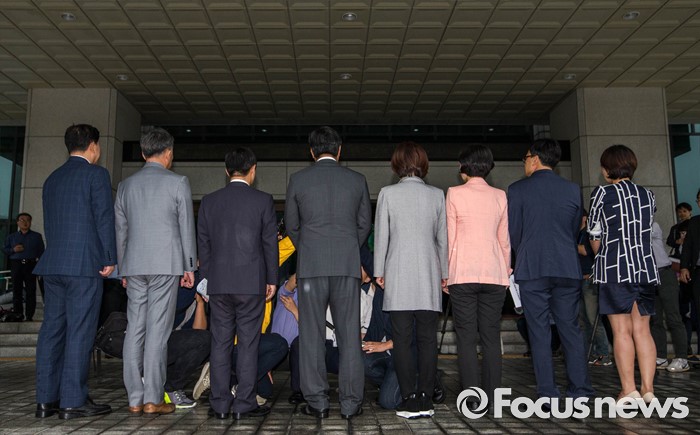 (서울=포커스뉴스) 15일 오후 서울 서초구 대검찰청 앞에서 더불어민주당 '어버이연합 등 불법자금지원 의혹 규명 진상조사 특별팀 (TF)' 이 항의 방문에 앞서 취재진 앞에서 인터뷰를 준비하고 있다. 오른쪽부터 더불어민주당 이재정, 박주민, 백혜련, 진선미, 이춘석, 박범계, 표창원, 김병기 의원.