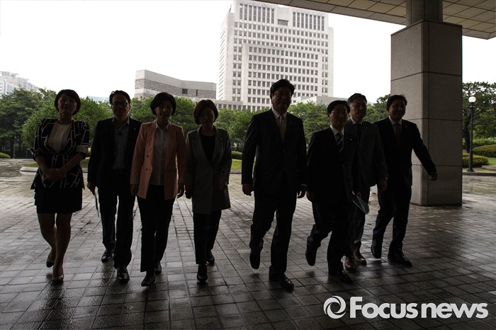 (서울=포커스뉴스) 15일 오후 서울 서초구 대검찰청 앞에서 더불어민주당 '어버이연합 등 불법자금지원 의혹 규명 진상조사 특별팀 (TF)' 이 항의 방문하고 있다. 왼쪽부터 더불어민주당 이재정, 박주민, 백혜련, 진선미, 이춘석, 박범계, 표창원, 김병기 의원.
