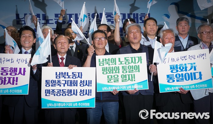 (서울=포커스뉴스) 15일 오후 서울 여의도 국회도서관에서 남북노동자통일축구대회 공동추진위원회 결성식를 마친 김동만 한국노총 위원장, 최종진 민주노총 위원장 직무대행 등 남측 추진위원회 참석자들이 한반도기를 흔들며 취재진을 향해 포즈를 취하고 있다.