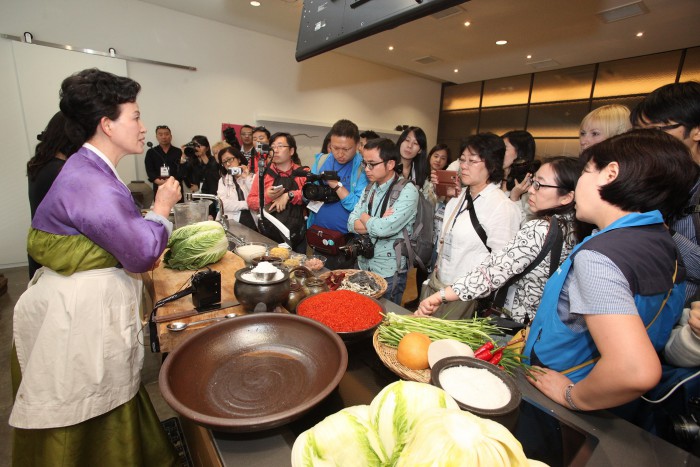 또한, 어린이 눈높이에 맞춰 전시 해설을 제공하는 '박물관 학교'를 신설, 매일 운영 중이다.지난해 5월 이하연 김치명인(사진 맨왼쪽)이 뮤지엄김치간을 방문한 80여명의 해외 언론사 기자와 여행사 관계자를 대상으로 '통배추김치 담그기'를 시연하고 있다.<사진제공=뮤지엄김치간>