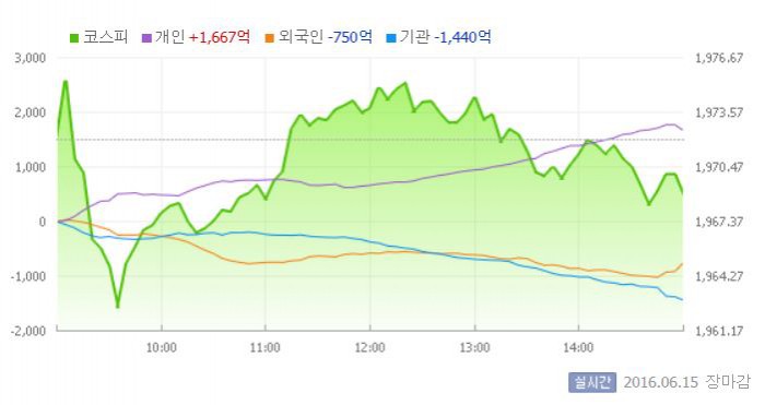 이날 코스피는 전일 대비 0.00% 하락한 1972.00으로 장을 시작했다. 이후 지수는 외국인과 기관의 팔자세에 1970선 아래로 내려앉았다.