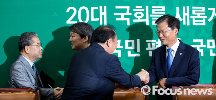 (서울=포커스뉴스) 안철수(왼쪽 두 번째) 국민의당 상임공동대표와 천정배(오른쪽) 공동대표가 15일 오후 서울 여의도 국회에서 열린 '전국시도교육감협의회 감담회'에 참석한 이재정(왼쪽) 경기도교육감, 장휘국(오른쪽 두 번째) 장휘국 전국시도교육감협의회 회장과 악수 하고 있다.