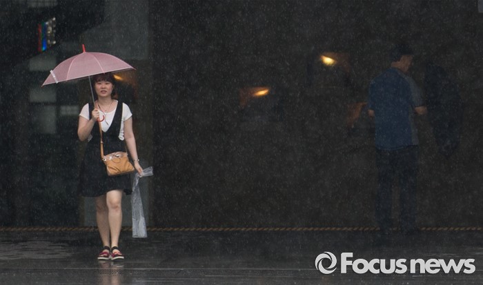 (서울=포커스뉴스) 전국적으로 비가 내리는 15일 오후 서울 종로구 광화문광장을 지나는 한 시민이 비를 바라보고 있다.