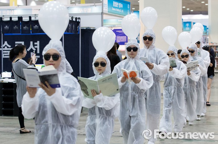(서울=포커스뉴스) 15일 오후 서울 강남구 코엑스에서 열린 2016 서울국제도서전에서 상상발전소 관계자들이 독서를 장려하는 퍼포먼스를 하고 있다.