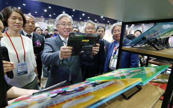 (서울=포커스뉴스) 김종덕 문화체육관광부 장관이 15일 서울 강남구 코엑스에서 열린 ‘제22회 서울국제도서전 및 제3회 디지털북페어코리아 개막식‘을 마치고 전시장 부스에서 스캐닝 북을 체험해보고 있다. <사진제공=문화체육관광부>