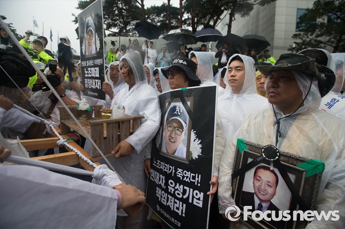 (서울=포커스뉴스) 15일 오후 유성기업 노동자 故 한광호씨의 분향소를 양재동 현대차 본사 앞으로 옮기는 꽃길 100리 행진에 참여한 노동자들이 현대차 본사 앞으로 들어서 분향소 설치로 인해 경찰과 유성 범대위 사람들이 대치하고 있다.