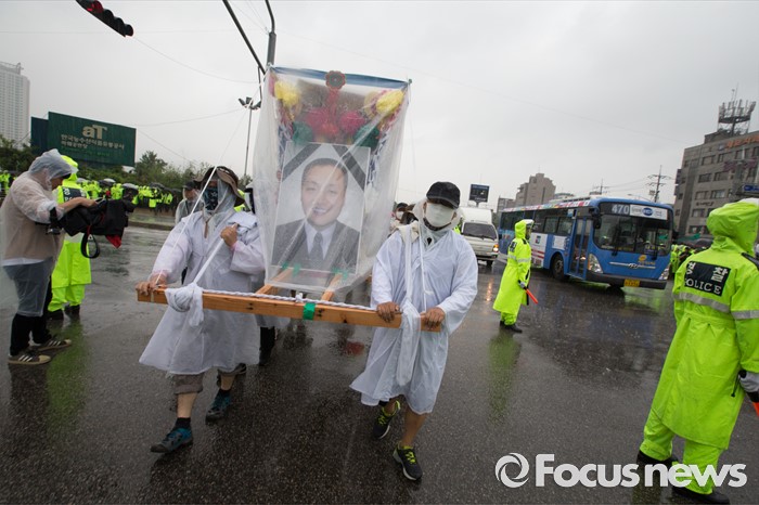 (서울=포커스뉴스) 15일 오후 유성기업 노동자 故 한광호씨의 분향소를 양재동 현대차 본사 앞으로 옮기는 꽃길 100리 행진에 참여한 노동자들이 현대차 본사 앞으로 들어오고 있다.