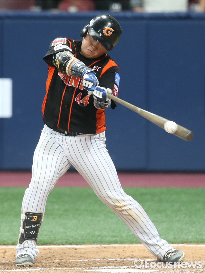(서울=포커스뉴스) 15일 서울 고척 스카이돔 구장에서 열린 2016 프로야구 롯데-넥센 경기 4회초 롯데 선두타자 김준태가 좌익수 왼쪽으로 안타를 치고 있다.