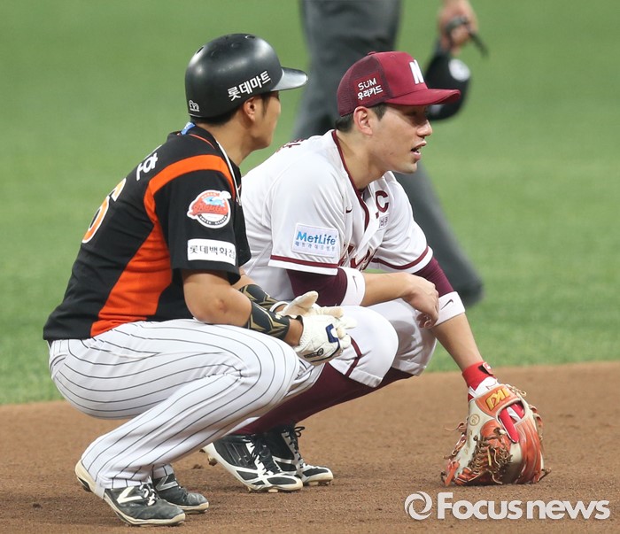 (서울=포커스뉴스) 15일 서울 고척 스카이돔 구장에서 열린 2016 프로야구 롯데-넥센 경기 4회초 투수 교체하는 동안 넥센 2루수 서건창(오른쪽)과 롯데 2루주자 김상호가 나란히 앉아 대화하고 있다.