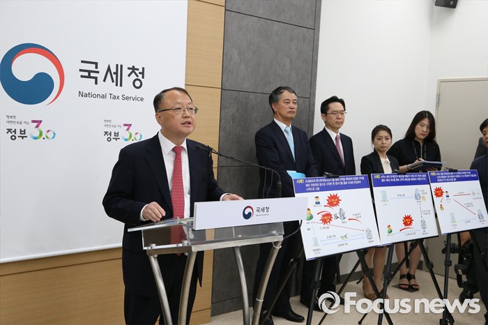(세종=포커스뉴스) 한상영 국세청 조사국장이 15일 오전 정부세종 2청사 국세청 기자실에서 지난 3월 역외소득·재산 자진신고 기간이 종료함에 따라 소득이나 재산을 해외에 은닉하고도 자진신고에 응하지 않은 역외탈세 혐의자 36명에 대해 세무조사를 착수했다고 밝히고 있다. <사진제공=국세청>