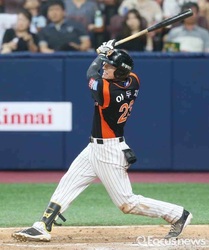 (서울=포커스뉴스) 15일 서울 고척 스카이돔 구장에서 열린 2016 프로야구 롯데-넥센 경기 6회초 롯데 아두치가 큼지막한 외야 플라이를 치고 있다.