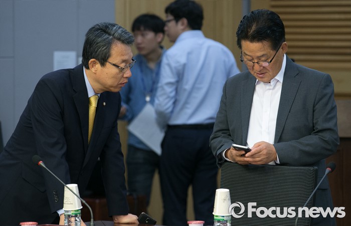 (서울=포커스뉴스) 16일 오전 서울 여의도 국회 의원회관에서 열린 국민의당 16차 정책역량강화 워크숍에 참석한 박지원(오른쪽) 원내대표와 김성식 정책위의장이 대화하고 있다.