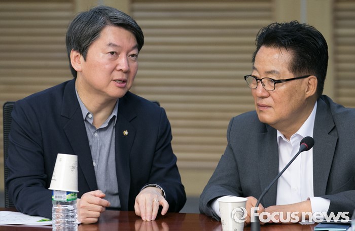 (서울=포커스뉴스) 16일 오전 서울 여의도 국회 의원회관에서 열린 국민의당 16차 정책역량강화 워크숍에 참석한 안철수(왼쪽) 상임공동대표와 박지원 원내대표가 대화하고 있다.