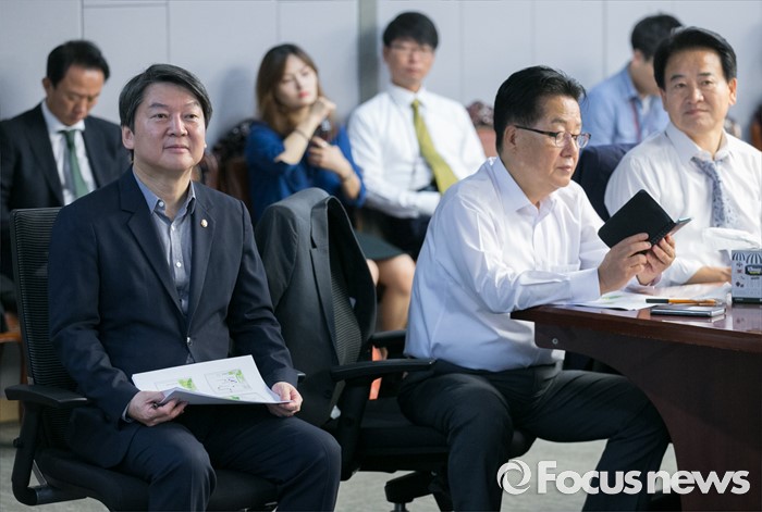 (서울=포커스뉴스) 16일 오전 서울 여의도 국회 의원회관에서 열린 국민의당 16차 정책역량강화 워크숍에 참석한 안철수(왼쪽부터) 상임공동대표, 박지원 원내대표, 정동영 의원이 홍종호 서울대 환경대학원 교수의 강연을 듣고 있다.