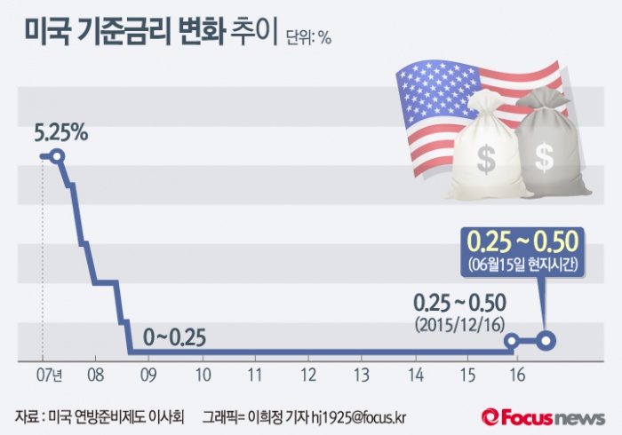 (서울=포커스뉴스) 미국 연방준비제도는 6월 15일(현지시간) 통화정책 결정기구인 연방공개시장위원회(FOMC) 정례회의를 열고 현행 0.25%~0.50%인 기준금리를 유지하기로 결정했다.
