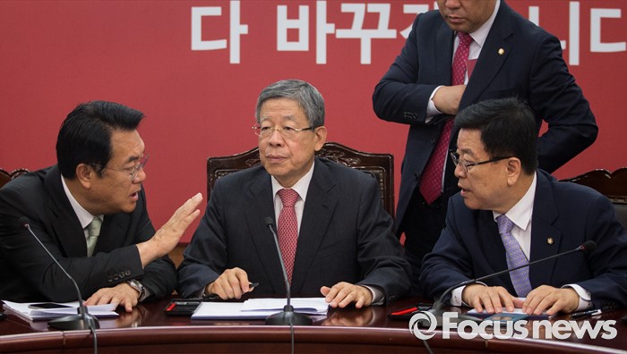 (서울=포커스뉴스) 김희옥(가운데) 새누리당 혁신비상대책위원장과 정진석(왼쪽) 원내대표가 무소속 복당 문제를 논의하기 위해 16일 오전 서울 여의도 당사에서 김광림 정책위의장과 함께 혁신비상대책위원 회의를 하고 있다.