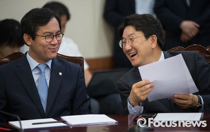 (서울=포커스뉴스) 권성동(오른쪽) 새누리당 혁신위 사무총장이 16일 오전 서울 여의도 당사에서 열린 혁신비상대책위원 회의에서 김영우 혁신위원과 대화하고 있다. 이 회의에서 새누리당 혁신위는 무소속 복당 문제를 논의 한다.