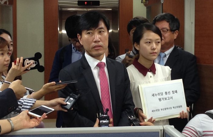 (서울=포커스뉴스) 하태경(왼쪽) 새누리당 부산시당 혁신위원장이 16일 오전 서울 여의도 당사를 방문해 김희옥 혁신비대위원장에게 20대 총선 패배 원인 및 건의사항 등이 담긴 활동보고서를 전달하기 위해 이동하고 있다. <사진제공=하태경 의원실>