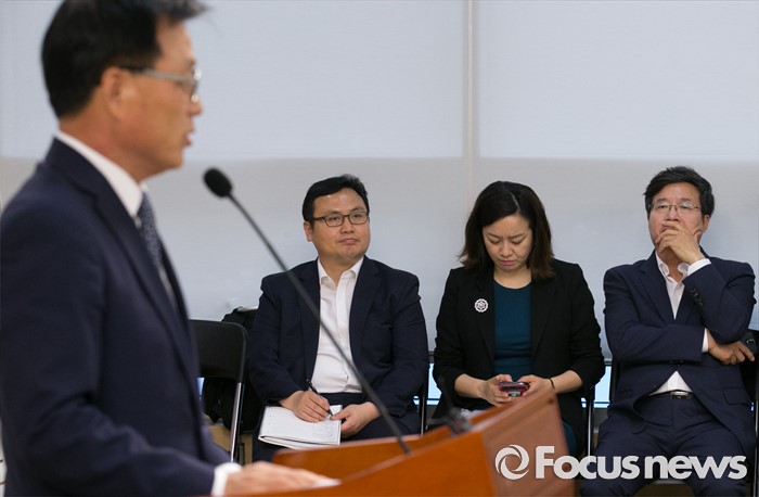 (서울=포커스뉴스) 16일 오전 서울 여의도 국회 의원회관에서 열린 지방재정 개편안 무엇이 문제인가? 긴급 좌담회에 참석한 염태영(오른쪽 첫번째) 수원시장이 박광온(왼쪽 첫번째) 더불어민주당 의원의 축사를 듣고 있다.