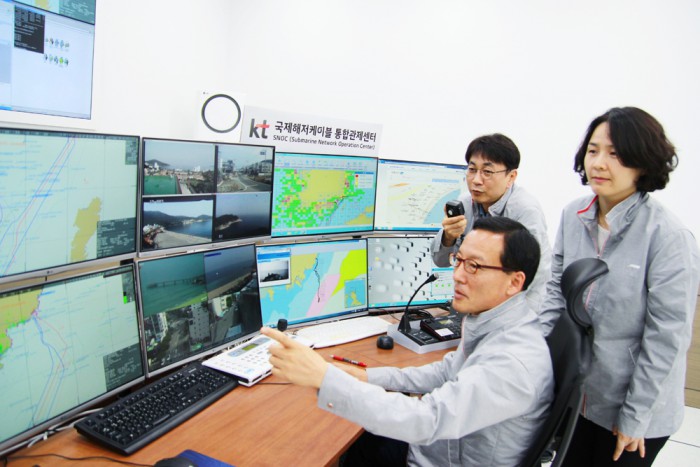 오성목 KT 네트워크부문 부사장은 “이번 국제해저케이블 통합관제센터를 통해 국제해저케이블 네트워크 구성과 운용부터 위기대응까지 한 곳에서 모두 처리가 가능해져 평창동계올림픽과 같은 국제행사의 안정적인 진행과 서비스를 제공할 수 있게 됐다”고 밝혔다.KT 직원이 부산 송정에 위치한 ‘국제해저케이블 통합관제센터’에서 해저케이블 장애여부를 확인하고 있다.<사진제공=KT>