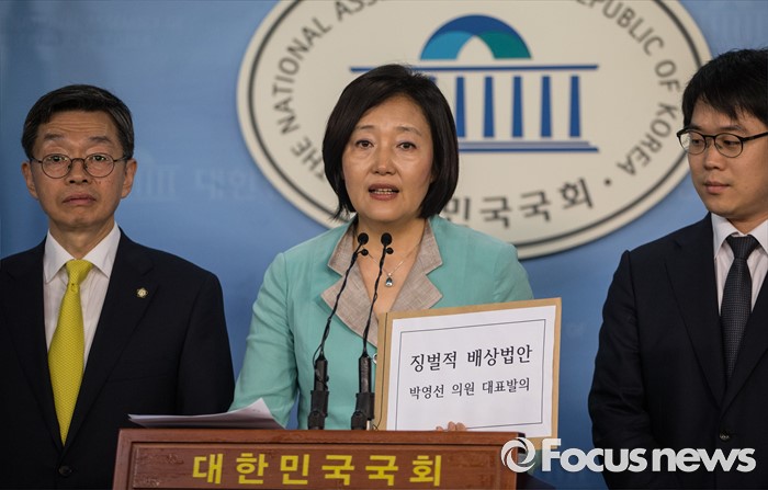 (서울=포커스뉴스) 16일 오전 서울 여의도 국회 정론관에서 박영선 더불어민주당 의원이 가습기 살균제 피해와 같은 대기업의 반사회적 불법행위를 막기 위한 '징벌적 배상법' 제정안 발의에 대한 기자회견을 하고 있다.