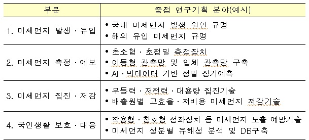 미래부는 관계 부처의 석탄화력발전, 경유차 미세먼지 감축 정책등과 병행해 과학기술 기반의 효과적인 미세먼지 솔루션을 개발·적용하는 한편, 이번 미세먼지 이슈를 계기로 국민의 안전과 건강을 보호하는 국민체감형 연구개발(R&D)을 강화해 일상생활의 애로를 해소하고 삶의 질과 편익을 제고할 수 있도록 노력할 계획이다.미세먼지 예방을 위한 중점 연구기획 분야.<표제공=미래부>