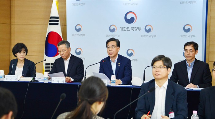 (서울=포커스뉴스) 송언석 기획재정부 차관이 6월 16일 정부서울청사에서 열린 '2015년도 공공기관 경영평가결과 및 후속 조치'와 관련하여 브리핑을 하고 있다. 왼쪽부터 박순애 경영평가 부단장, 반장식 경영평가 단장, 송언석 차관, 정기준 기재부 공공정책국장. <사진제공=기획재정부>