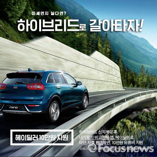 (서울=포커스뉴스) 중고차 거래 애플리케이션 헤이딜러가 하이브리드 차량의 판매 촉진을 위한 유류비 지원 이벤트 '미세먼지 싫다면? 하이브리드로 갈아타자!'를 진행한다.