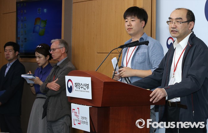 (세종=포커스뉴스) 장옌 상하이샐비지 부사장이 16일 오후 세종시 정부세종청사 해양수산부 기자실에서 세월호 선체인양에 대한 설명을 하고 있다.