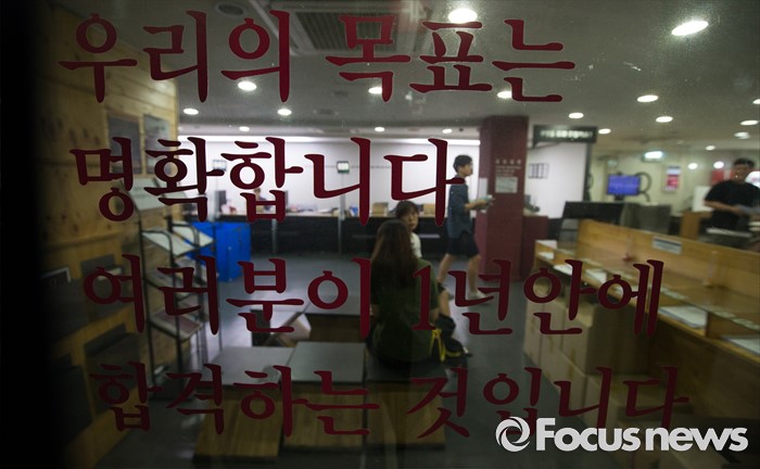 (서울=포커스뉴스) 지방직 9급 공무원 필기시험을 이틀 앞둔 15일 오후 서울 동작구 공단기 노량진학원에 응원 문구가 적혀 있다.
