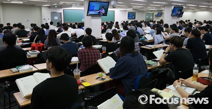 (서울=포커스뉴스) 지방직 9급 공무원 필기시험을 이틀 앞둔 15일 오후 서울 동작구 공단기 노량진학원에서 시험 응시자들이 강의을 듣고 있다.