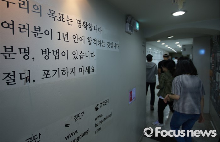 (서울=포커스뉴스) 지방직 9급 공무원 필기시험을 이틀 앞둔 15일 오후 서울 동작구 공단기 노량진학원에 응원 문구가 적혀 있다.
