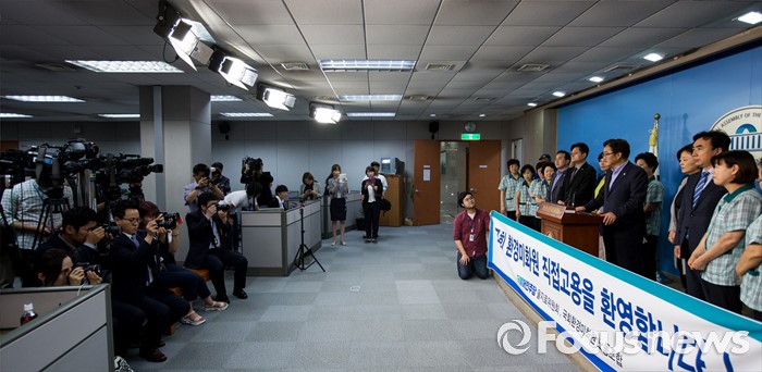 (서울=포커스뉴스) 국회 환경미화노동조합원들과 더불어민주당 을지로위원회 소속 위원들이 16일 오후 서울 여의도 국회에서 정세균 국회의장의 국회 환경미화원 직접고용 입장 발표에 환영의 뜻을 밝히는 기자회견을 하고 있다.