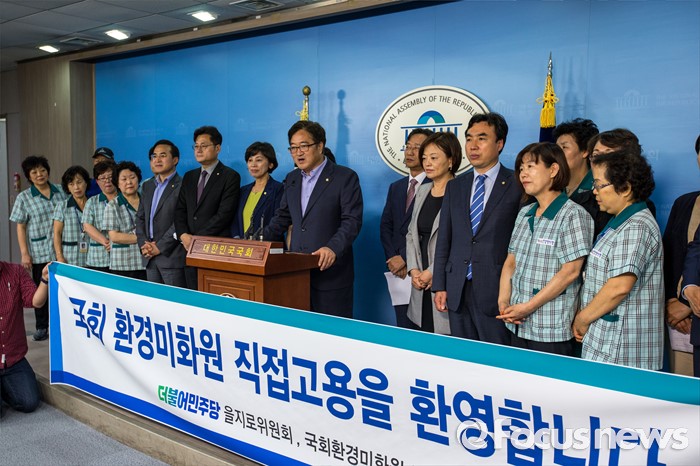 (서울=포커스뉴스) 국회 환경미화노동조합원들과 더불어민주당 을지로위원회 소속 위원들이 16일 오후 서울 여의도 국회에서 정세균 국회의장의 국회 환경미화원 직접고용 입장 발표에 환영의 뜻을 밝히는 기자회견을 하고 있다.