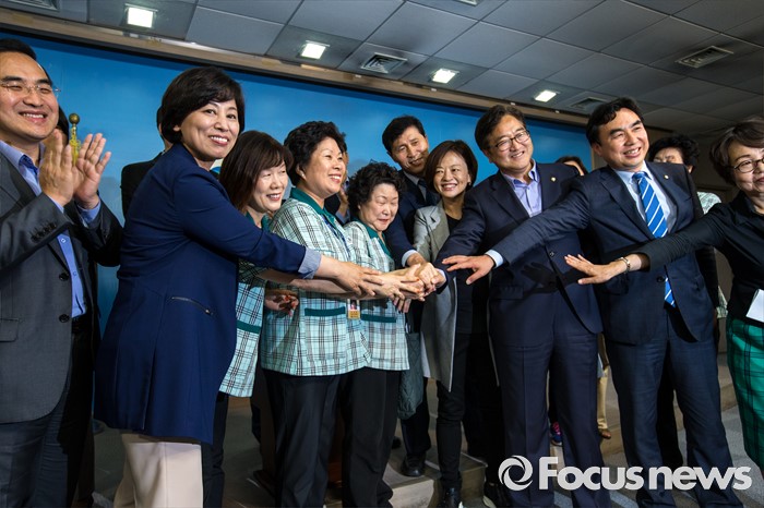 (서울=포커스뉴스) 우원식 더불어민주당 을지로위원회 위워장을 비롯한 위원 및 국회환경미화노동조합원들이 16일 오후 서울 여의도 국회에서 정세균 국회의장의 국회 환경미화원 직접고용 입장 발표에 환영의 뜻을 밝히는 기자회견을 마친 뒤 손을 맞잡고 사진촬영을 하고 있다.