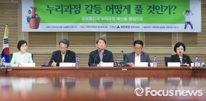 (서울=포커스뉴스) 16일 오후 서울 여의도 국회 의원회관에서 열린 '누리과정 갈등 어떻게 풀 것인가' 토론회에 참석한 안철수 국민의당 상임공동대표가 축사를 하고 있다. 왼쪽부터 김삼화 의원, 김성식 정책위의장, 안 대표, 박지원 원내대표, 최도자 의원.