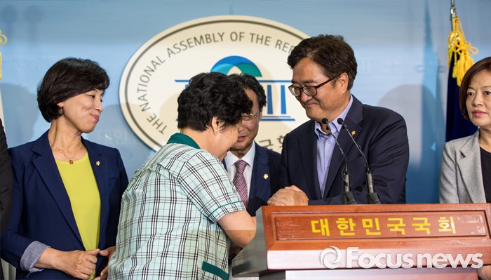 (서울=포커스뉴스) 우원식 더불어민주당 을지로위원회 위워장과 김영숙 국회환경미화노동조합 위원장이 16일 오후 서울 여의도 국회에서 정세균 국회의장의 국회 환경미화원 직접고용 입장 발표에 환영의 뜻을 밝히는 기자회견을 마친 뒤 악수 하고 있다.