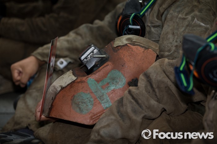 (서울=포커스뉴스) 이틀 전 총파업을 결의한 대우조선해양 노조가 16일 오후 서울 여의도 산업은행 앞에서 사측의 일방적 구조조정에 반대하며 상경투쟁을 벌이고 있다. 작업복을 입고 용접 마스크를 가져 온 한 조선업 노동자가 상경투쟁 집회에 앉아 있다.