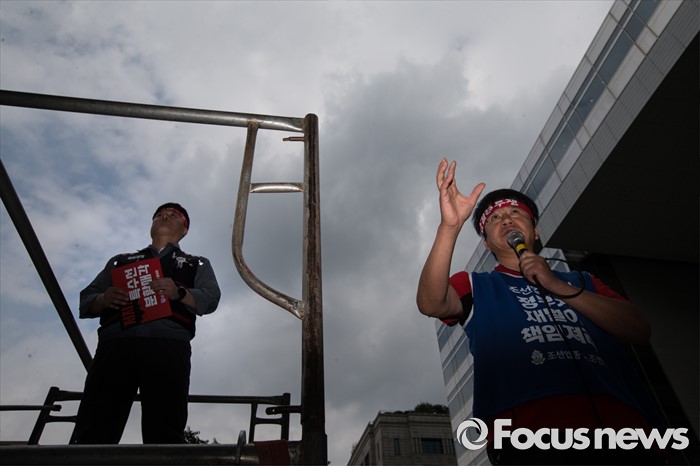 (서울=포커스뉴스) 이틀 전 총파업을 결의한 대우조선해양 노조가 16일 오후 서울 여의도 산업은행 앞에서 사측의 일방적 구조조정에 반대하며 상경투쟁을 벌이고 있다.