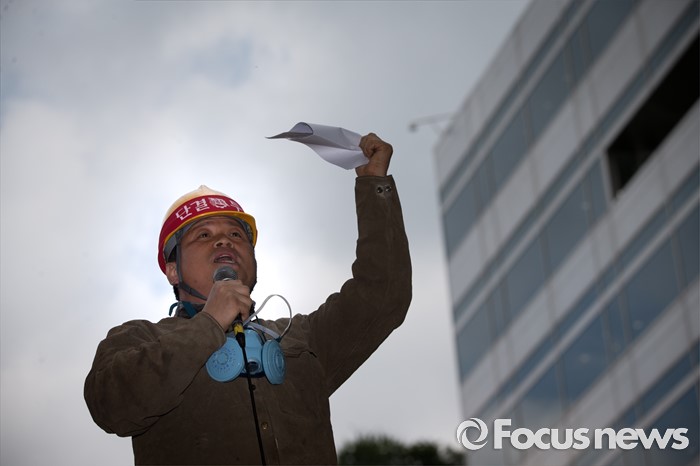 (서울=포커스뉴스) 대우조선해양의 한 노동자가 16일 오후 서울 여의도 산업은행 앞에서 열린 상경투쟁에서 사측의 일방적 구조조정에 반대하며 목소리를 높이고 있다.