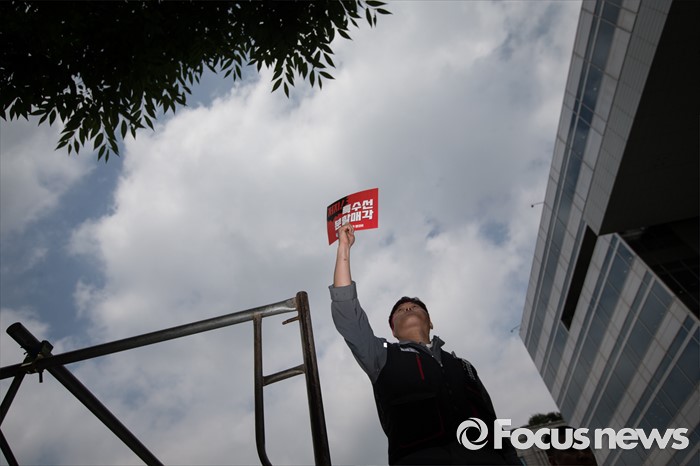 (서울=포커스뉴스) 이틀 전 총파업을 결의한 대우조선해양 노조가 16일 오후 서울 여의도 산업은행 앞에서 사측의 일방적 구조조정에 반대하며 상경투쟁을 벌이고 있다. 한 노조원이 '특수선 분할매각 저지' 피켓을 들고 투쟁 결의를 하고 있다.
